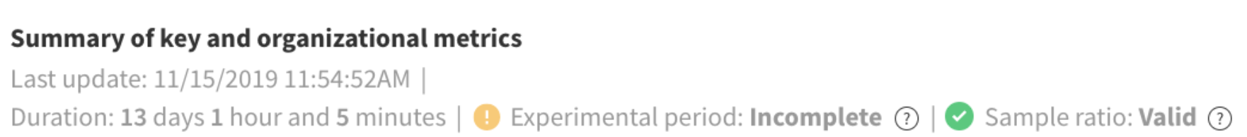 The Harness FME platform performs a sample ratio check with each calculation update to monitor for a significant deviation between the targeted and current sample ratios. This sample ratio check is located beneath the summary of key and supporting metrics with other key information including duration and last updated.